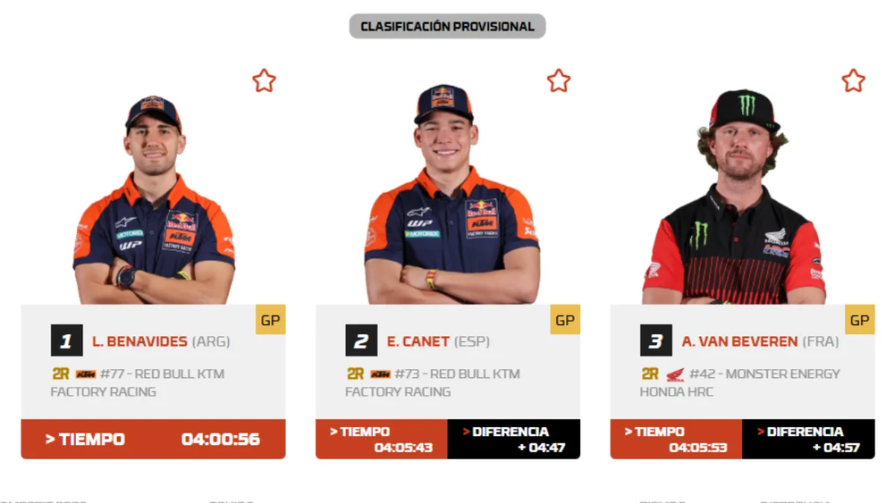 Esta agresividad en la navegación y el manejo le permitió aventajar por 4m 47s a su compañero de equipo, el español Edgar Canet, y por casi cinco minutos al francés Adrien Van Beveren de Honda. El líder de la general, Daniel Sanders, finalizó en el cuarto lugar tras verse condicionado por la difícil tarea de abrir pista, lo que permitió que el salteño le descontara un tiempo precioso en la lucha por el preciado trofeo.